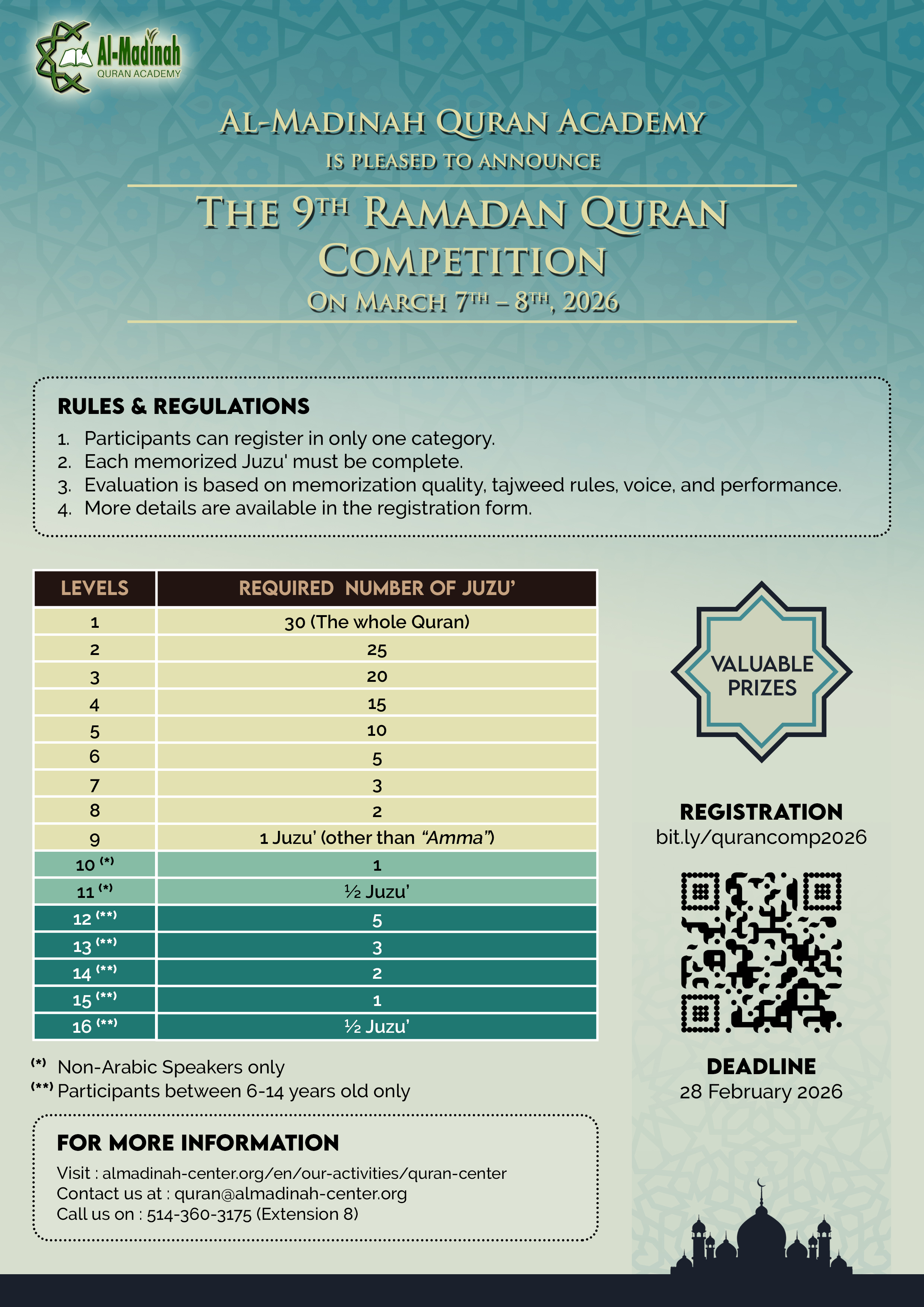 Al-Madinah Quran Academy has been established, under Al-Madinah Center, to serve the ever-growing Muslim Community in Montreal. The ultimate goal of this academy is to signify the relationship between the Muslim community in Montreal and the Holy Qur’an in terms of both educational and moral values. The Academy will gladly serve any person interested in learning the Holy Qur’an, regardless of gender, age, or languages spoken.